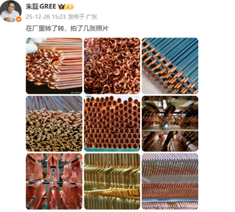 近日,格力市场总监朱磊在微博晒出了工厂图,现场满满的全是空调铜管。此举也是在回应近期的争议,尤其是海尔、美的、小米等多家空调发声遵守《空调铝强化应用研究工作组自律公约》之后,“铝代铜”的话题就一直被行业和消费者关注。