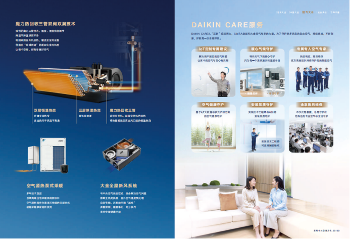 DAIKIN CARE 全生命周期服务依托真人空气管家与 IoT 大数据,主动推送节能建议。包括地暖出水温度调节方案、滤网清洗保养提醒等,从运维层面保障设备始终处于高效节能运行状态。