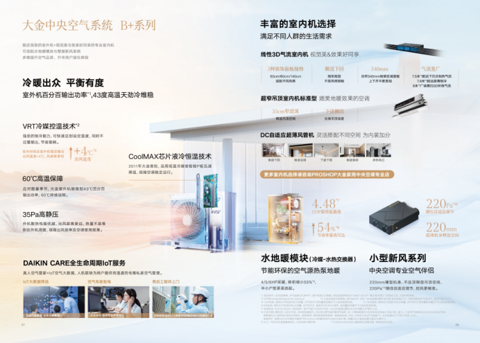 在节能与舒适平衡上,大金B+系列精准匹配小户型日常使用场景,既省电又能保障体验。核心的VRT冷媒控温技术,可精准调节冷媒温度,解决过渡季节低负荷运转时的温度波动问题,减少压缩机频繁启停,降低能耗。线性3D气流室内机通过4枚横向百叶与262枚纵向百叶切割气流,形成0.3m/s亲肤软风与1.8m无风感区域,7.8m远距送风可覆盖狭长空间,无需多台设备叠加运行。全系列内机搭载直流电机与多维降噪技术,DC自适应超薄风管机,最低运转音仅17分贝,轻静听感,不打扰日常休息。配合DAIKIN CARE全生命周期IoT服务,AI可结合使用数据提供节能建议,搭配空气源热泵地暖技术(对比传统锅炉费用最高省54%),进一步降低长期使用成本,同时依托PROSHOP专业安装体系与全国1000+网点服务,安装与售后保障充足,彻底打消小户型用户顾虑。
